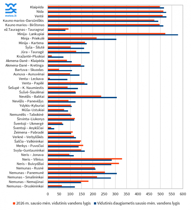Vidutinis sausio mėnesio vandens lygis didžiojoje dalyje šalies upių svyravo nuo 5 iki 87 cm žemiau vidutinio daugiamečio sausio mėnesio vandens lygio. Tik vietomis, Rytų ir Pietų Lietuvoje, jis buvo 3–46 cm aukščiau vidurkio.