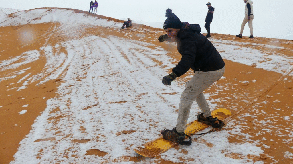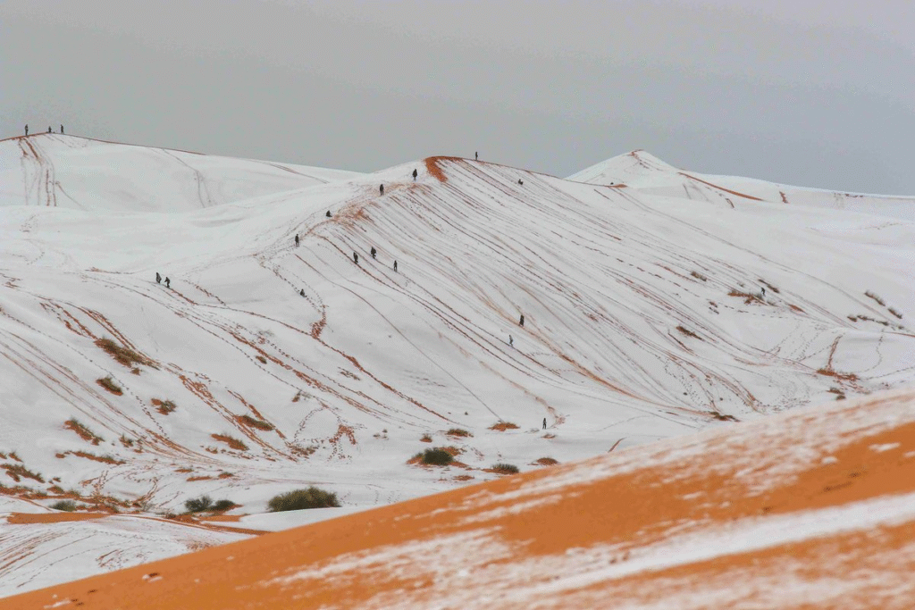 Sacharos dykumoje oranžinės smėlio kopos akimirksniu tapo baltomis – nukritus oro temperatūrai iš dangaus šią savaitę pabiro snaigės.